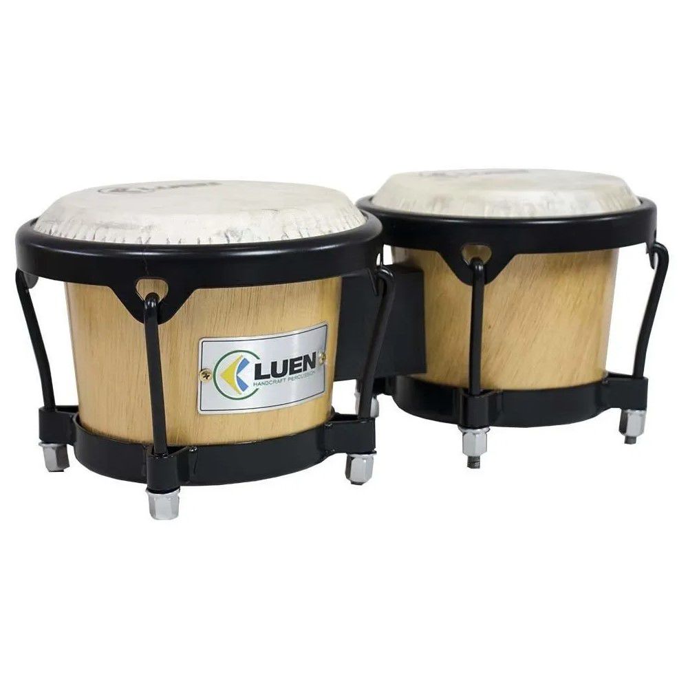 Bongo em madeira, com pele animal, ferragens pretas, tambores de 6 e 7 polegadas, tamanho médio mais usual da Luen, de exelente qualidade. Pele em couro que tem uma melhor sonorização.