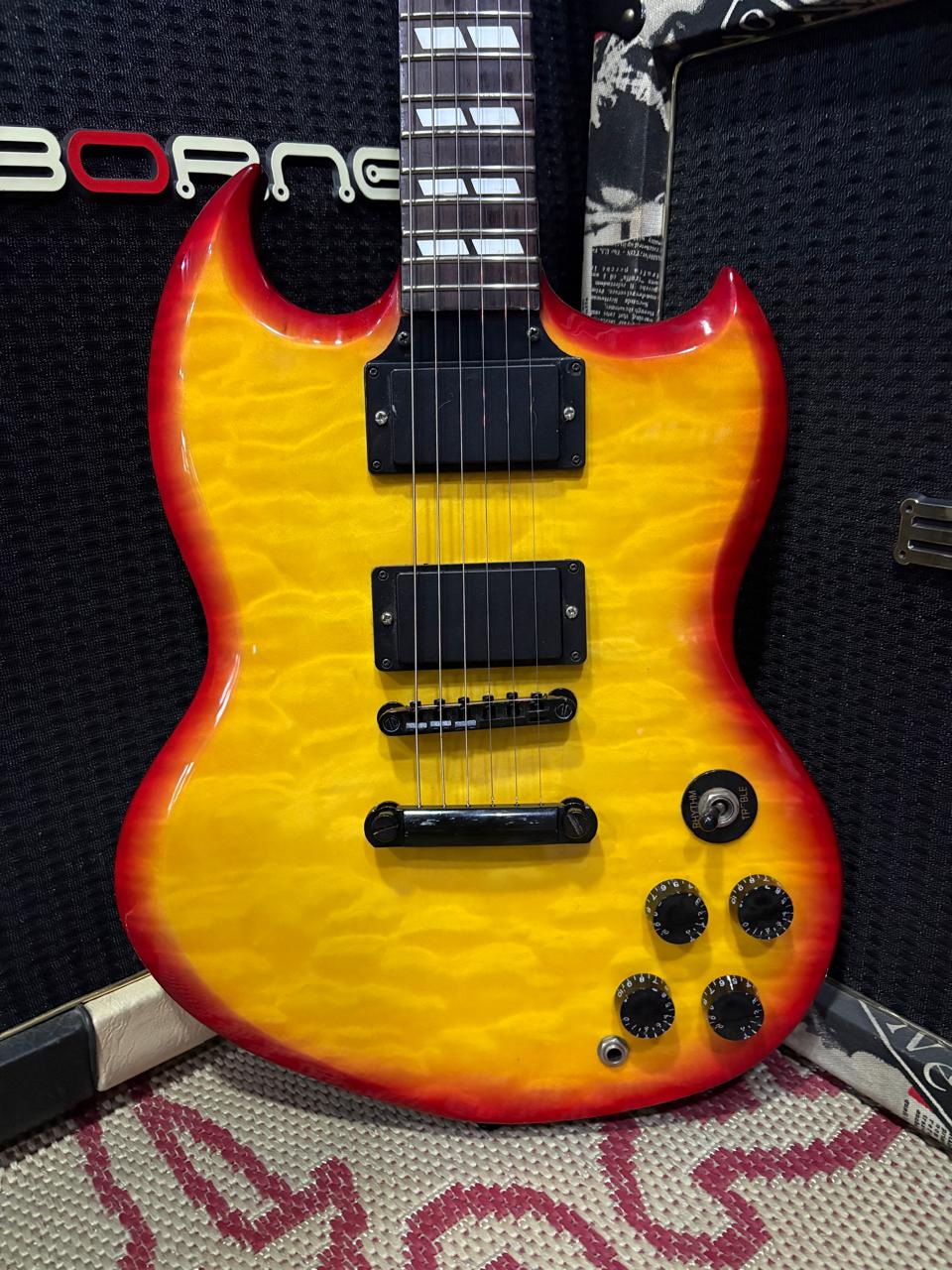 Inspirada no tradicional modelo SG, ela conta com construção de braço colado (set-in), que proporciona melhor transferência de vibração e sustain mais prolongado. Seu conjunto de captadores humbuckers entrega timbres encorpados e versáteis, ideais para estilos como rock, blues e hard rock.