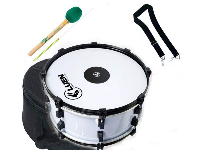 A única Zabumba com aros Blacksteel e com afinadores e garras especiais . A zabumba da Luen contém um ótimo Acabamento com sua perfeita afinação dupla onde lhe dá mas segurança na hora de Tocar com seu instrumento. Características Material Aluminio Tamanho 18'' zabumba de 18 polegadas de diâmetro e 20cm de altura e corpo em aluminio peles leitosa 8 afinações de cada lado