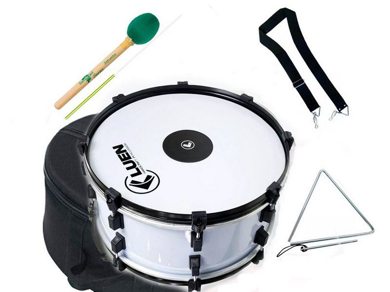A única Zabumba com aros Blacksteel e com afinadores e garras especiais . A zabumba da Luen contém um ótimo Acabamento com sua perfeita afinação dupla onde lhe dá mas segurança na hora de Tocar com seu instrumento. Características Material Aluminio Tamanho 18'' zabumba de 18 polegadas de diâmetro e 20cm de altura e corpo em aluminio peles leitosa 8 afinações de cada lado
