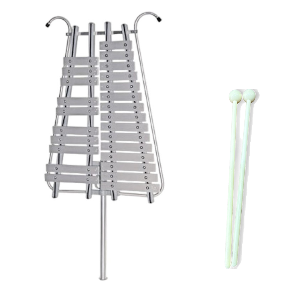 Construída com corpo em resina e alumínio, oferece resistência e leveza, facilitando o transporte e o uso prolongado em ensaios e apresentações. Suas 25 teclas em alumínio polido, com 31mm de largura e 9,5mm de espessura, são afinadas individualmente, contam com a estampa de cada nota musical e possuem furos rebaixados, fixadas com 2 parafusos e acompanhadas de abafadores de som em borracha, garantindo estabilidade e clareza sonora.