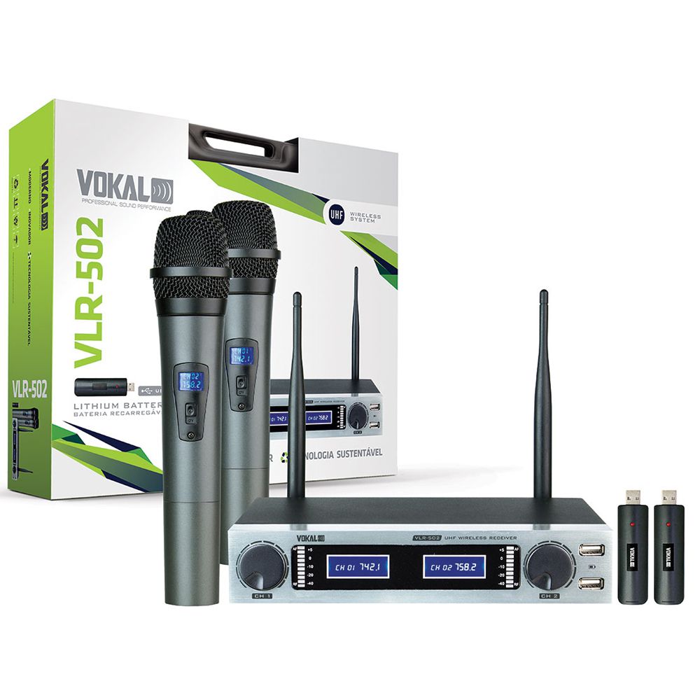 Utilizando-se de tecnologia sustentável, com a sua bateria de Lithium recarregável, o novo Vokal VLR-502 é um microfone sofisticado e inovador. Com o seu alto desempenho, o VLR 502 é um lançamento exclusivo para o mercado nacional e a garantia de um produto moderno, repleto de vantagens tecnológicas. Além da bateria de Lithium recarregável, é possível utilizar o VLR-502 com duas pilhas AA, sem perder a eficiência do microfone. O kit acompanha dois microfones de mão sem fio, duas baterias de Lithium, uma base receptora de sinal UHF onde, também, executa a função de recarregar as baterias de Lithium e um case de proteção.