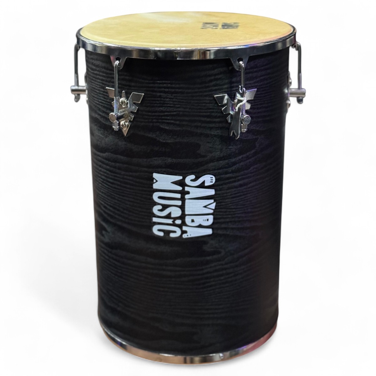 Corpo de madeira, revestido com lâmina de alto brilho e pele de couro que transmite uma sonoridade grave para marcação.